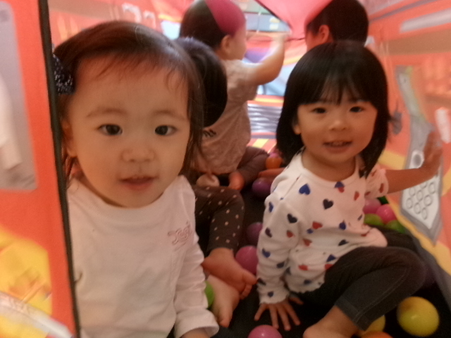 室内でボール遊びを楽しみました。消防車型のボールプールに大喜びで、窓から可愛い顔を覗かせてくれました。投げたボールがくっつく的当てでは、一生懸命に投げて、くっついたボールが増えていく様子をとても楽しんでいました。