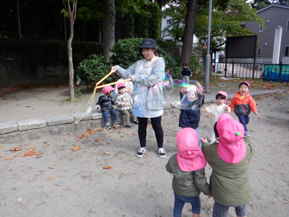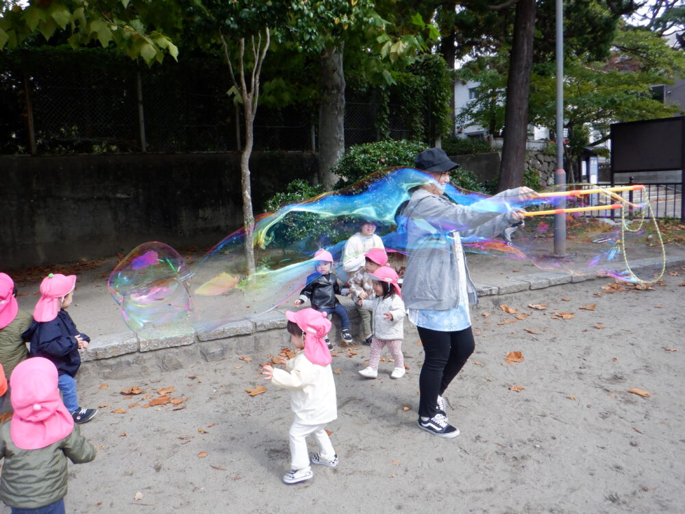 大きな大きなしゃぼん玉で遊んだよ。